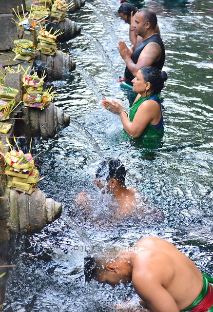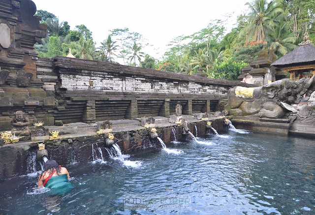 Last on our list that day was Tirta Empul Temple which literally means “holy water” in the Balinese language. The temple complex comprised of few courtyards. Jaba Tengah, located in the inner courtyard, is where locals and tourists go down the purification pool, submerged themselves in a very cold stream of water, and dip themselves on around a dozen of waterspouts. Locals also ask bathers to buy Balinese canang offerings to offer the gods during their purification process.