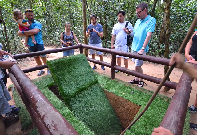 The guide proceeded to pick a cover from the heap of dried leaves. We then realized that it was the entry point to the tunnels. For the enemies not to discover the passages, the constricted pits are covered and stacked with leaves to camouflage on the forest floor. Our guide dared one of the German guys on the group to enter the tunnel on that hole. He just gave instructions on how to navigate the tunnels and head to the exit hole a few meters away.