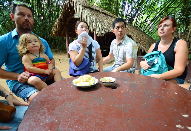 Some of us got muddy so the guide led us to a pipe spurting flowing water to get ourselves cleaned. Everyone was asked to sit around the table where a bowl of steamed cassava and brown sugar were served. It was a culmination feast for everyone for surviving the tunnels of Cu Chi. Last stop of the activity is a dugout featuring other booby traps used during the war. Traps like rolling trap, window trap, and sticking trap. Next to it is a building where you can buy souvenirs like shirts, ceramics, and more.
