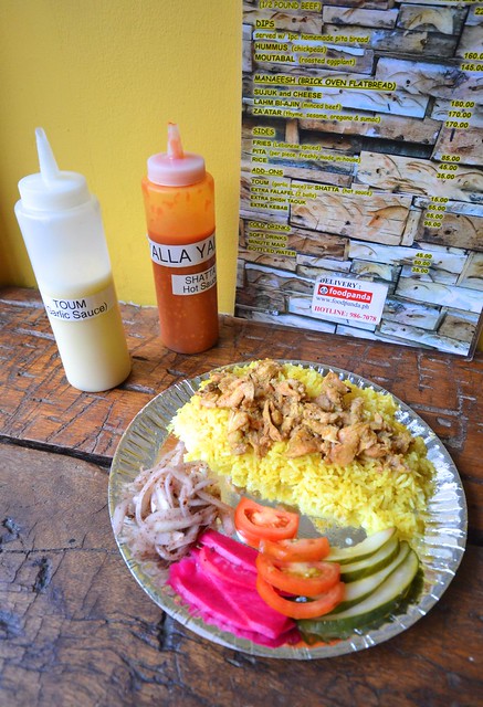 Yalla Yalla Express provides Lebanese food like beef and chicken shawarma, kebab, falafel, shishtaouk, and sujuk. All mains are available in either wrap or rice versions. In addition, they have burgers, brick-oven pizza, fries, pita, and baklava for dessert. For the chicken shawarma rice at PHP155, serving is a bit small but the flavors of the fluffy rice and tender chicken blend well with their toum (garlic sauce) and shatta (hot sauce). The pickled vegetables served on the sides were also explosives in terms of tang.