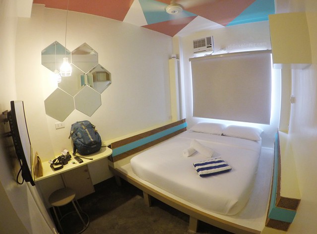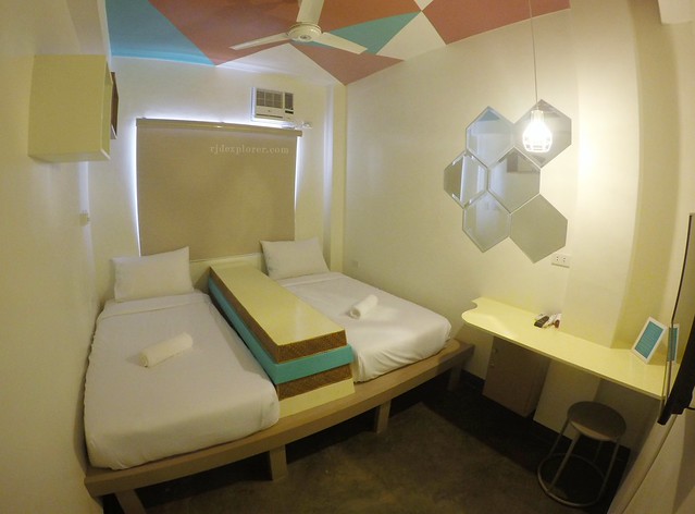 For a hostel, the private room is really impressive having a colorful abstractly painted ceiling with the ceiling fan that properly distributes the cool temperature from the AC unit. Large and hexagonal-sized mirrors make the room bright, while cabinets are available where you can place your personal stuff. The bathroom is equipped with hot and cold shower, and the toilet has a bidet. Hair dryer was also available.