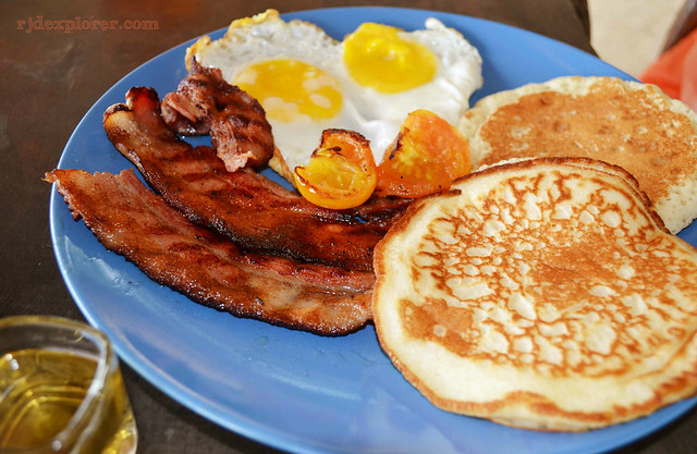 I ordered Cowboy’s Feast (195 + service charge), corned beef perfectly sautéed with onions and sweet tomatoes served with sunny-side-up eggs and rice (or bread). Ate Nats went for Pancakes (Php 195 + service charge) served with honey syrup, crispy slices of bacon, and eggs.