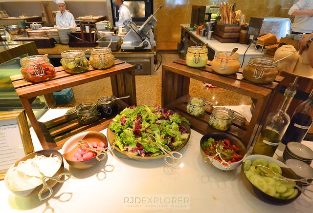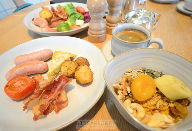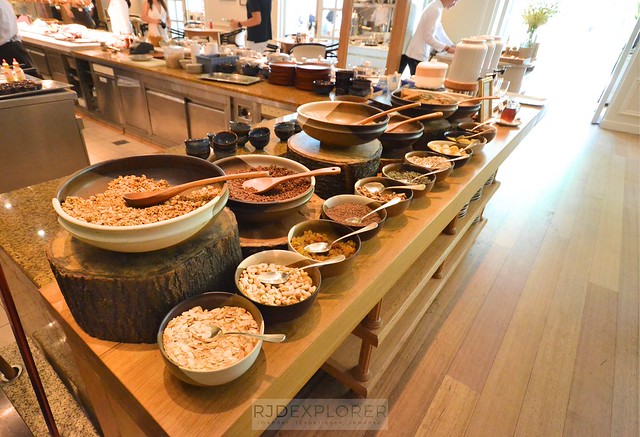 Buffet spread is centralized within the main dining room, making it easy for guests to go around and pick and mix-and-match their food for breakfast. The comprehensive options include the breakfast selections from cereals, nuts, seeds, and compotes; English breakfast such as sausage, bacon, grilled tomatoes, and herbed potatoes.