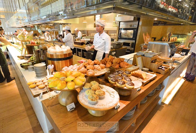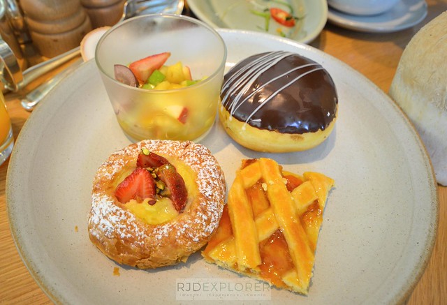 Other sections of the buffet are bread and pastries, salad, cured meat and smoked salmon, and cheeses. Bread section offers a varied spread including a baguette, milk panini, fruit and nut bread, wheat bread, and bagel. Fresh fruits and juices, minimal desserts like matcha chia seeds and mango yogurt. Alongside the salad section is a fresh coconut juice serve directly from its shells.
