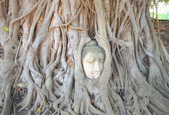 After an information overload, we checked the first heritage site on our list that day, Wat Mahathat. If you’re familiar with the area, this is where you can find the famous ‘head of a Buddha in tree roots’. The entangled head was part of a sandstone Buddha image which fell of the main body onto the ground and gradually trapped into the roots of a Banyan Tree.