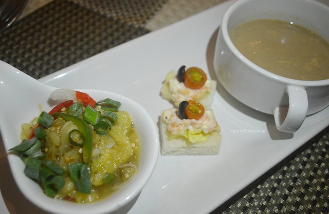 On dinner, we found out that the chef already pre-selected the food for the night. On the menu handed to us were Cream of Mushroom Soup, Smoked Fish Canape (appetizer), Eggplant Salad, Back Ribs with Chipotle BBQ Sauce and Spiced Asian Marinated Chicken for main courses, Mango Float for dessert, and a glass of Lemon Grass Tea for a quencher.