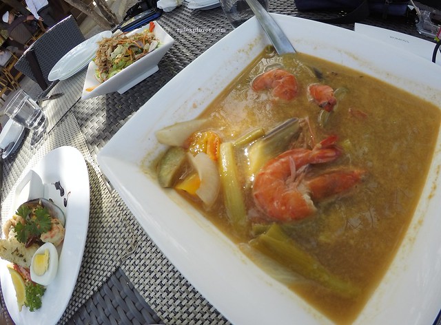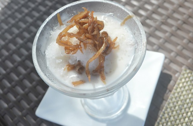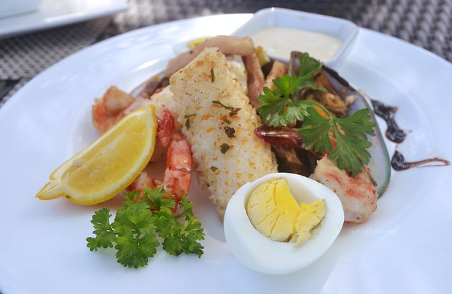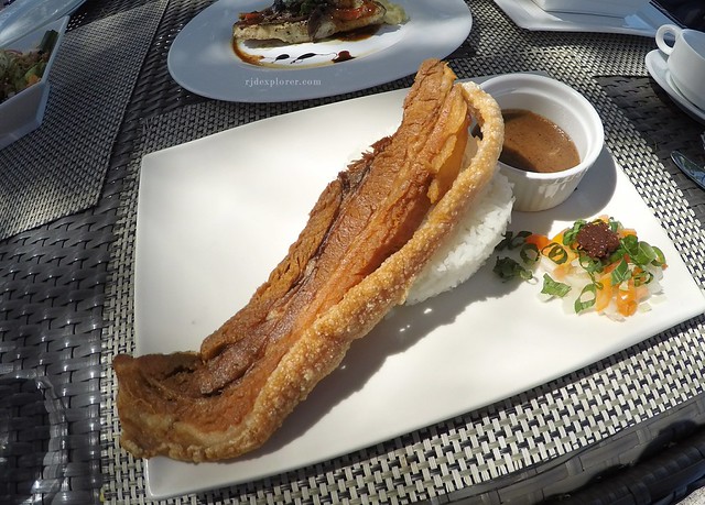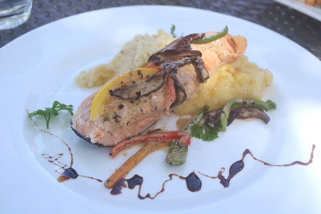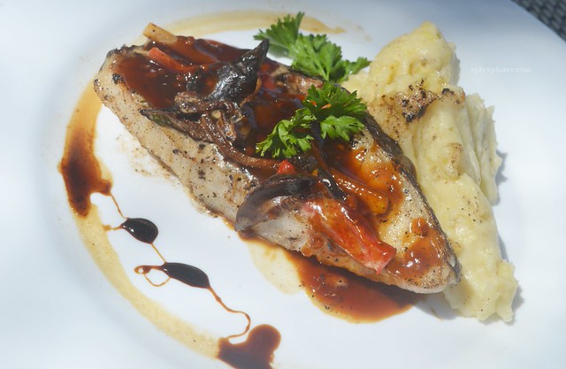 Roasted Chilean Seabass (Php560) is oven-baked fillet of seabass with edamame and soy ginger reduction. Poached Salmon (Php760), poached salmon with creamed mushrooms, peas and served with mashed potato was the highlight of the meal for me. I forgot every food I ate on the island due to super tender salmon. Well, I felt sorry for the Lechon Kawali (Php430) that it followed the first two dishes but I commend the crispiness of the pork belly skin. It was served with a native sauce but I found myself enjoying the pork meat with the garlic mayo served with the grilled seafood platter.