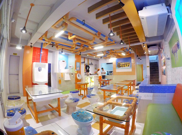 The dining area was exemplary designed in line with the restaurant’s name: glasses on top of bath tubs supported by some plastic riser tubes serve as tables, real toilet bowls with colorful covers as seats, while plungers and chamber pots (arinola) play as lighting fixtures.