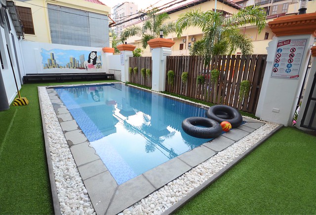 The reception is at the lower ground of the colonial villa. The compound has a pool bar on the side and a lounge carpeted with artificial turf and has several wooden tables and chairs for some hang-outs. The regular-sized pool on the front yard is usually crowded during noontime until sunset. Across the road is another property housing the communal rooms with a restaurant on the ground floor.