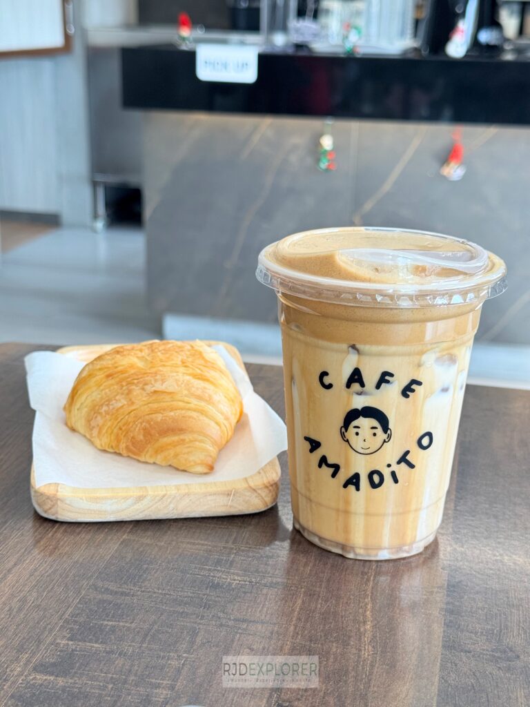 Food options are simple but satisfying. All-day breakfast, sandwiches, pasta, and pastries cost Php100–140. I tried a croissant baked in-house—flaky, buttery, and perfect with coffee. The star is the Amadito, their signature drink. Espresso, milk, and a hint of cinnamon top with lightly dusted foam. The milk felt plain at first, and the cinnamon was subtle, but it’s still a unique house-special worth trying.