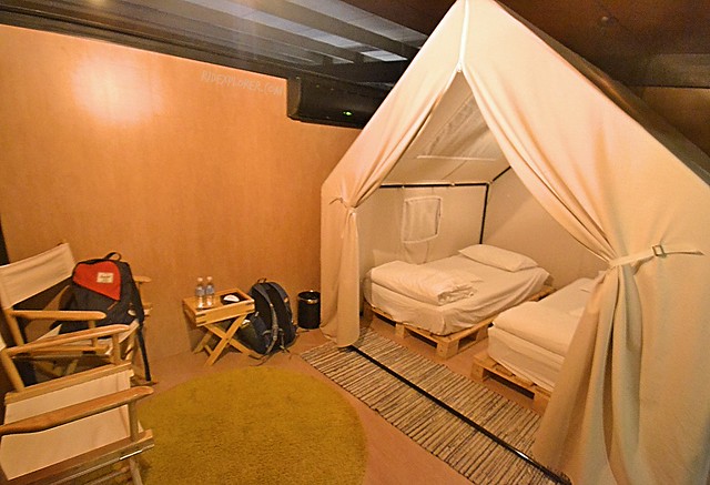 Camping ground is on the topmost floor. If I remember it right, they have four rooms for that kind. The entire room is very visible from the outside with the floor-to-ceiling glass. It wouldn’t be a camping if there’s no tent. Privacy of guests is provided by the tent housing two twin-sized beds. The beds are placed over wooden crates and secured with clean beddings, pillows, and blankets. There are also camping desk and chairs.