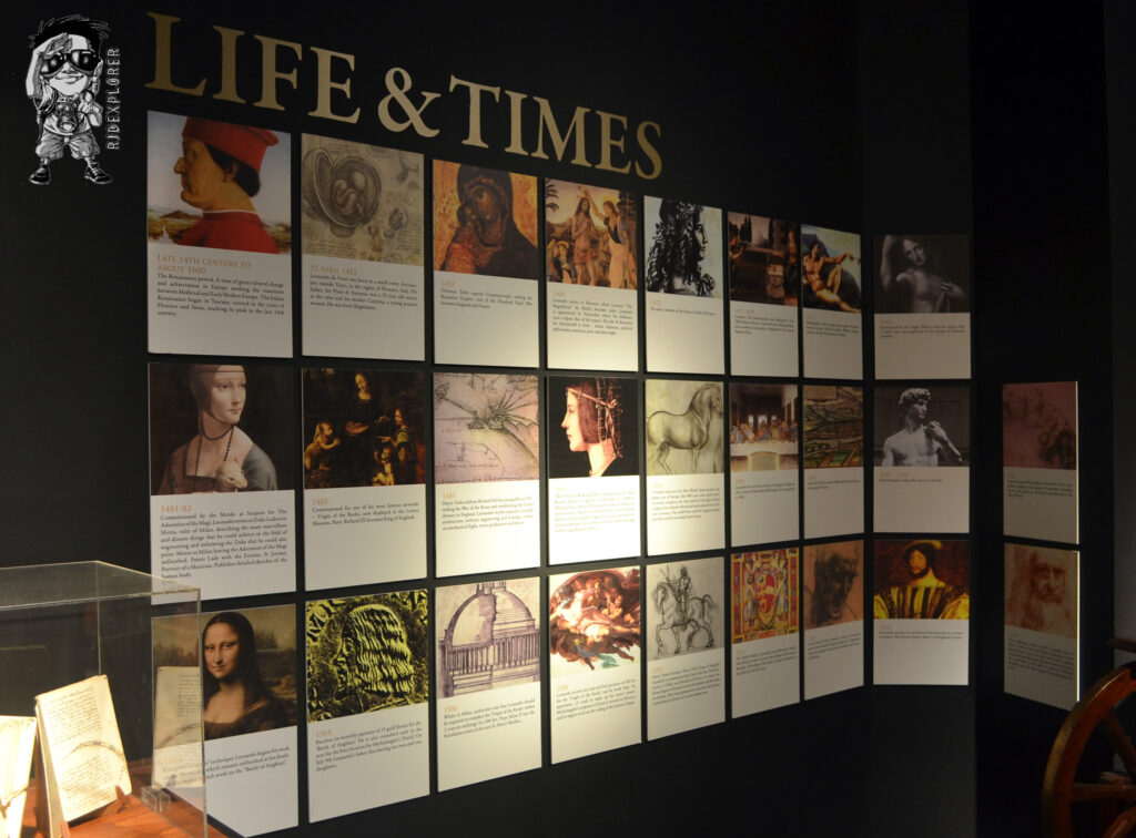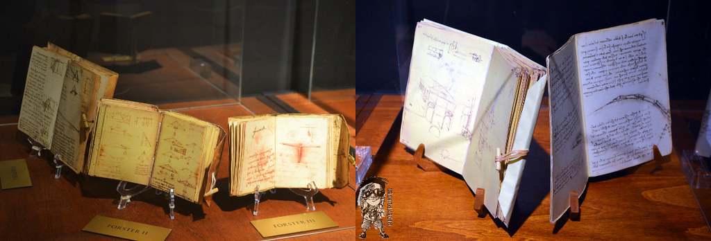 Towards the end of his life, Leonardo began organizing his manuscripts. They were bequeathed to his pupil and heir Francesco Melzi, but were later dispersed and sold. Many of the manuscripts were lost. About 6000 pages of Leonardo’s notes and drawings survive, mostly bound in a number of notebooks or codices. On display are replicas of some of the most important codices.