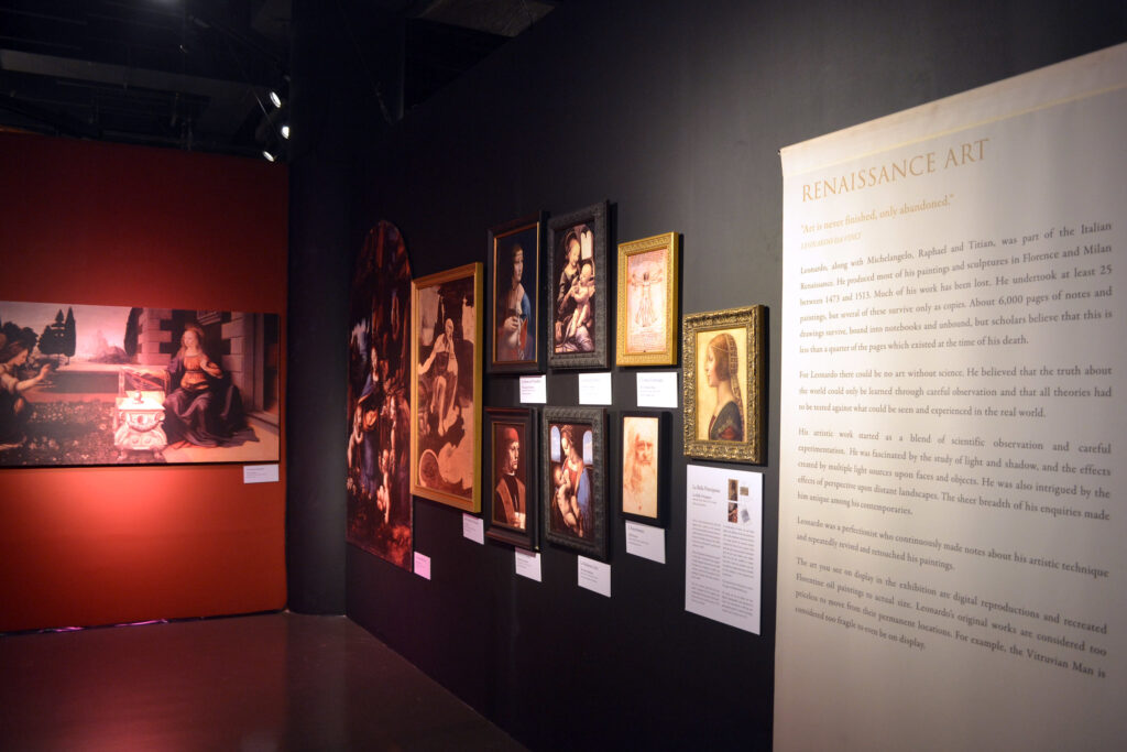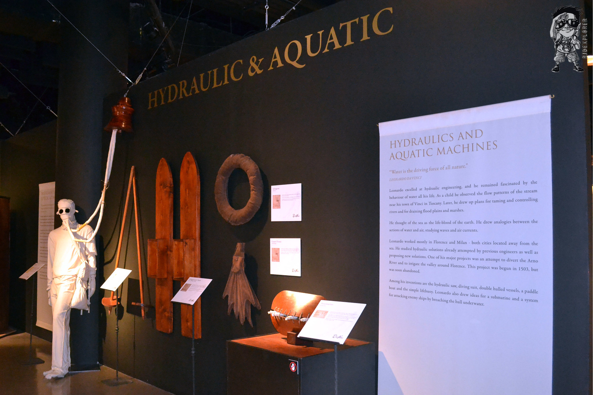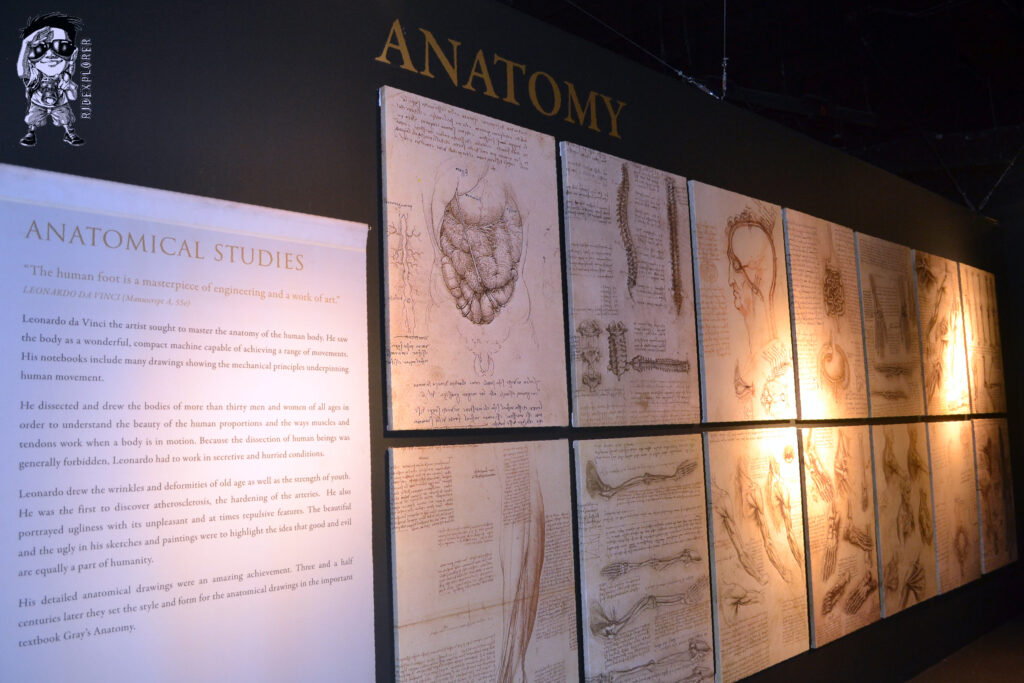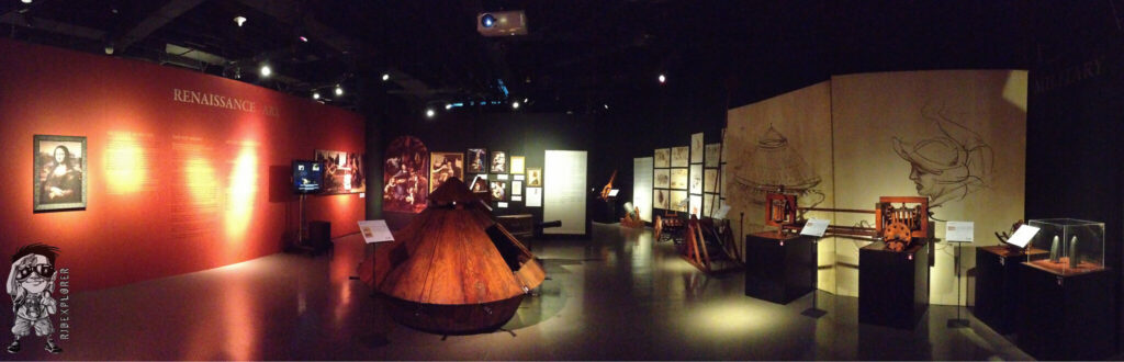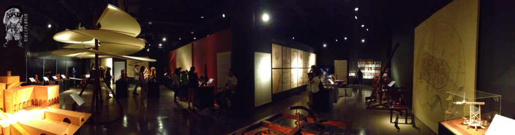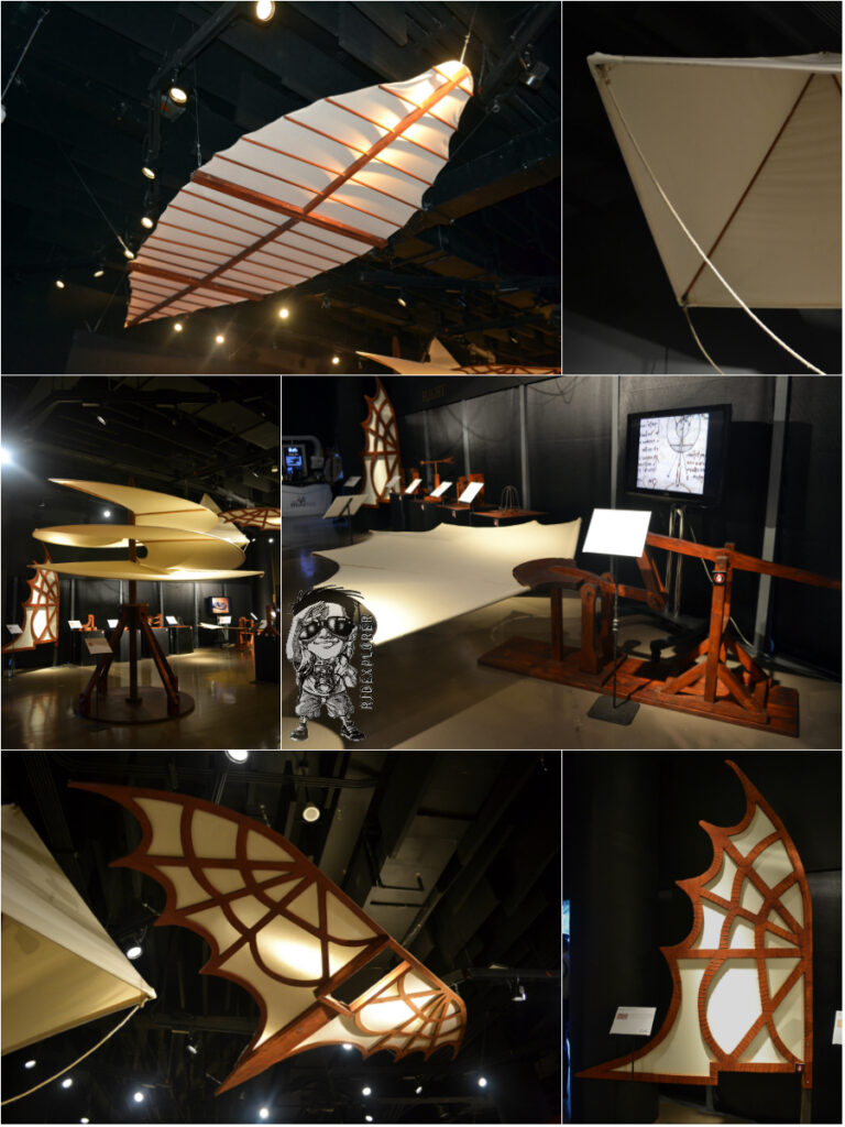 It shows full-scale interpretations of his works and studies of his known arts. The exhibit hall was divided into some parts: Flight, Physics, Civil Machines, Anatomy, Codices, Renaissance Art, Military Engineer, Music and Optical, and Hydraulic and Aquatic. It is also interactive that visitors can actually able to push, pull and crank some of these exhibits.
