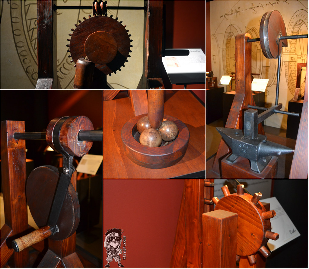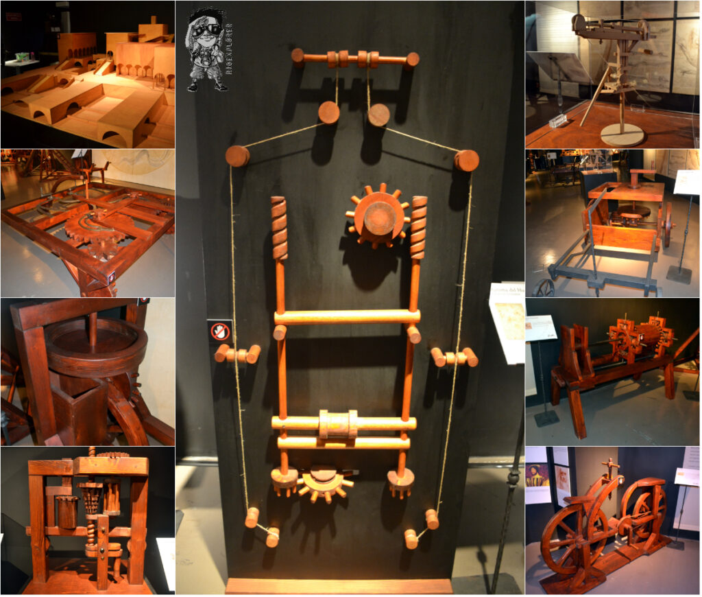 The section has 13 interactive exhibits that you can push, pull and crank. The devices in this section show Da Vinci’s fascination with force and friction, rotation and motion, and lifts and weights. The devices feature his ideas of toothed wheels, rotating shafts, cranks and gearwheels, ball bearing, rope and pulley system, locking system, and rotating cams (wheels with shaped bumps on them).