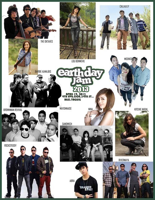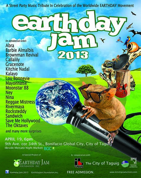 Earthday Jam is a special project of Earthday Jam Foundation, Inc, is FREE TO THE PUBLIC and is sponsored by DENR, PCSO, Smart Communications, Energy Development Corporation, Shell Philippines Exploration B.V., First Gen Corporation, PAGCOR, NLEX, Bonifacio Global City and Gery’s Grill. Media partners include Philippine Star, Business World, ABS CBN and MYX Music Channel with FM stations Radio High 105.9 and Crossover 105.1, Manila Concerts and Philippine Concert Scene. For updates and more info, join Facebook: Earthday jam 2013 or Earthday Jam Foundation, log on to www.dimitriproductions.com or email dimitriproductions@gmail.com.