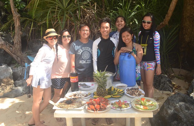 Going to the beach means cruising along Tapiutan Strait that really has an impeccable view of the Karst mountains on Tapiutan and Matinloc Islands. Once we docked on the cove, the tour crew offloaded all things needed in preparing our lunch by the beach. Northern Hope Tours prepared a scrumptious and hefty lunch with steamed crabs, grilled squid, fish, pork, and eggplant as selections and cucumber salad, watermelon, and pineapple for fruits. The food was really good and I enjoyed the crabs that are really expensive when you are in the city. Aside from the superb taste, we also appreciated the garnishing efforts they did on the viands.