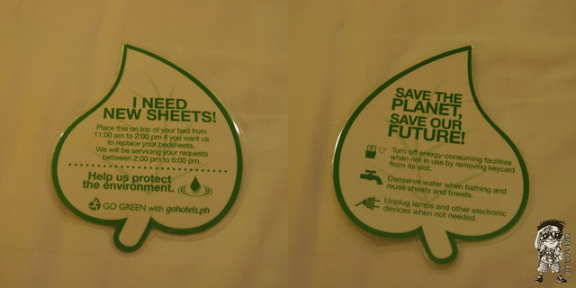 Housekeeping is scheduled between 2PM to 6PM and if you want your bedsheets to be replaced with a new one, you just need to place the “leaf sign” having the “I need new sheets!” on top of your bed. It goes the same with the used towels. Go Hotels support the Go Green Project and maintain this by placing some tips and suggestions in protecting the environment.