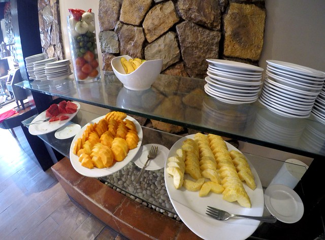 On the end of the hall placed the basket of soft breads like pandesal, sweet rolls, wheat and American bread. In addition to these are fresh fruit platters like watermelon, pineapple, papaya, and banana. Located between these two stations is the dish of the day, tuna roll and bacon, during our stay. On the side is the omelette section where you can choose your preferred ingredients, hot coffee, tea, fresh milk and cereal are also available. Last is the salad and cheese station.