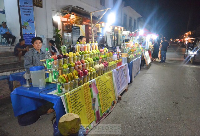 At one end of the night market, lined with bright red and blue-roofed booths, are the fruit shake stands. Some even offer a twist—a fruit shake with whiskey. The German guy, who had already been in Luang Prabang for two weeks, led us to what he claimed was the best one. And he was right. The vendor asked how much whiskey we wanted added to our shakes—and she was incredibly generous. Each order came in two glasses! Did I mention how generous she was? That moment marked the start of our fun night in Luang Prabang.