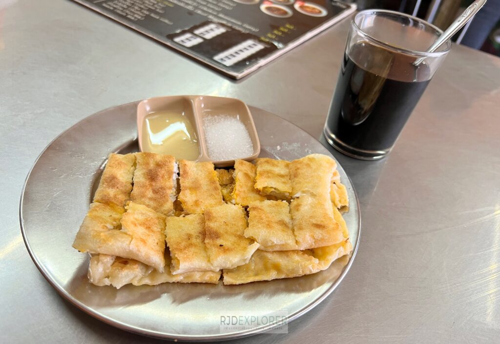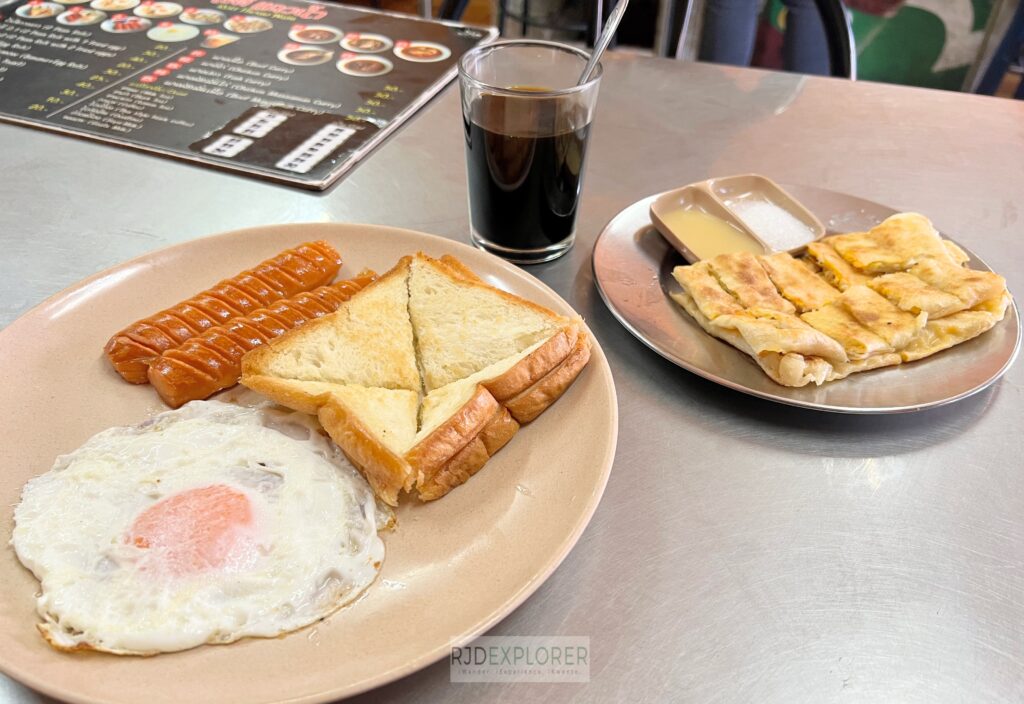 One early morning, I walked into Roti Thaew Nam, drawn by locals lining up outside. The shop’s front opens onto a wide charcoal griddle where fried meals sizzle under the morning light. I ordered the breakfast set: one fried egg, two chicken sausages, and French toast. I also tried banana-and-egg roti drizzled with condensed milk and sugar. Each bite balanced sweetness, texture, and warmth. The scent of cooking butter, roti, and smoke filled the air, grounding me in the quiet rhythm of Old Town mornings. It was a breakfast to linger over while watching locals come and go.
