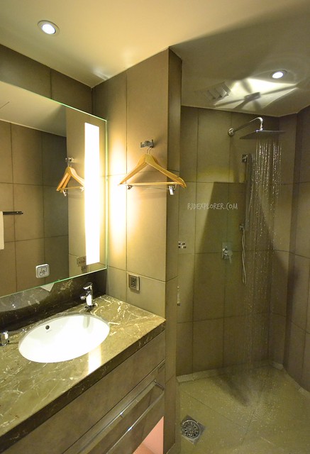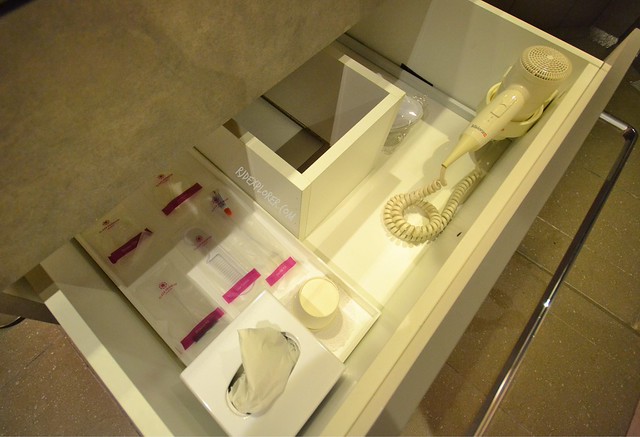 For a lounge, I didn’t expect anything on the en-suite bathroom. But the facility shocked me; sink with large vanity mirror, toilet has bidet, and hot and cold shower. Shower has handheld and overhead spouts, fresh and clean towels, and shower amenities like shampoo and shower gel. When I checked the drawer, added perks such as dental kit, shaking kit, and hair dryer stunned me.