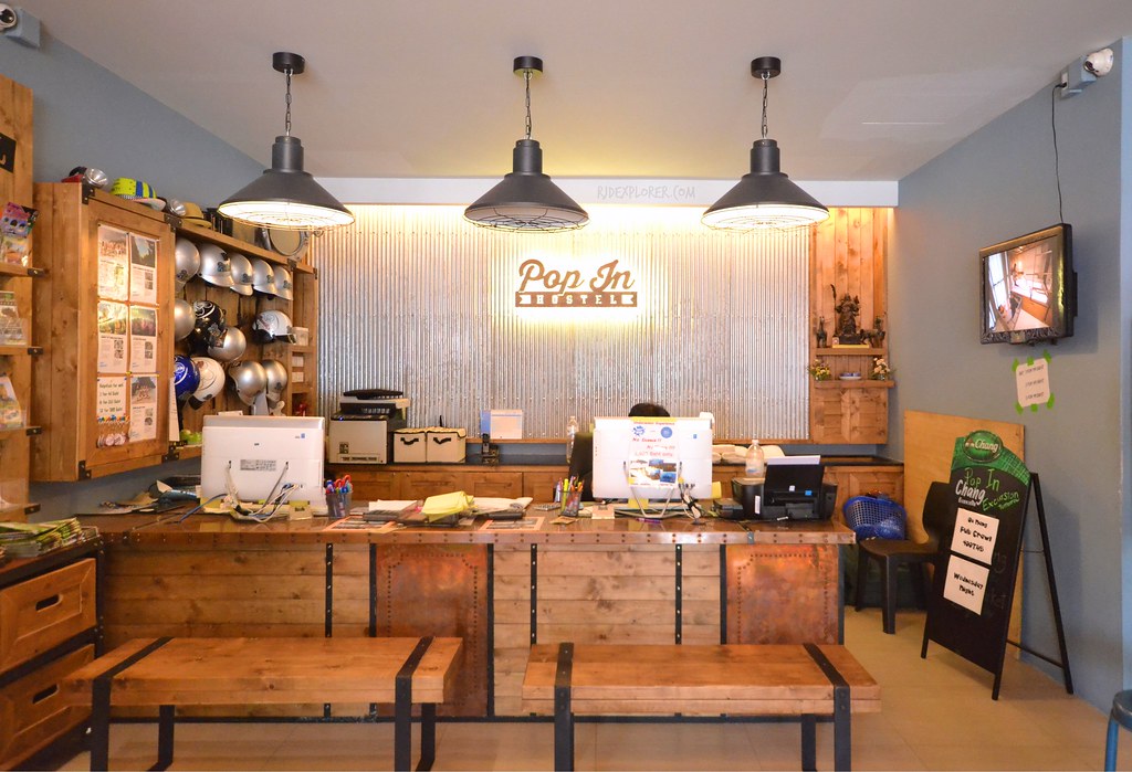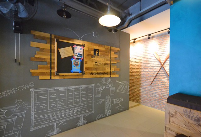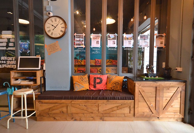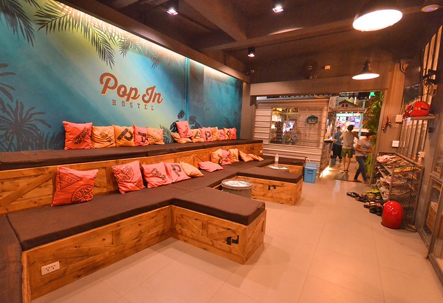 Reception area of Pop-in Hostel is dominated by wood from tables, cabinets, stools, and racks filled with tourism promotions. The hostel also sells their brand’s merchandise like tank tops and t-shirts. If you stay for five nights, you get a free one. If it’s too long for you, you can have one for only THB199.