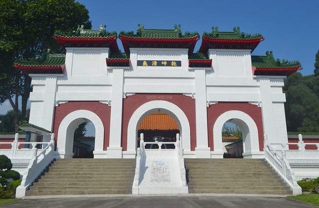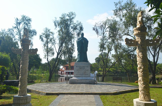 The adjacent “lake” is being bordered by the Tea House Pavilion, Stone Boat, and Confucius Statue. The Ming Hsiang Hsieh (tea house) and the Yao-Yueh Fang (stone boat), on opposite banks, have red posts, on white concrete platforms, that support the tiled roofs. Trees canopied a wooden boardwalk and I enjoyed the spot where I sat for minutes while watching a monitor lizard whirl on the water.