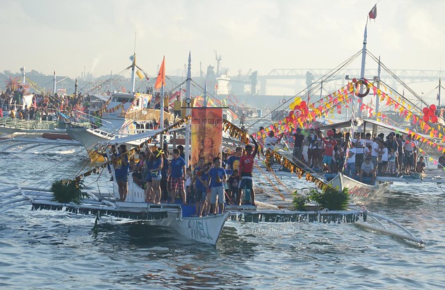 We lost track how many craft, from ferries to small outtrigger boats, loaded with faithfuls dancing, singing chants, and carrying the images of the Child Jesus joined the parade. People who weren’t able to reserve access to boats contentedly waited for the vessel carrying the image to pass by their area. When the crew noticed that we were already on the tail of the parade, we stopped somewhere near Pier Uno, followed by the decision of the captain to turn around and go back to the origin. It was a long 5 hours for us given that we went directly from work without any sleep yet the event was a great activity to experience during Sinulog.