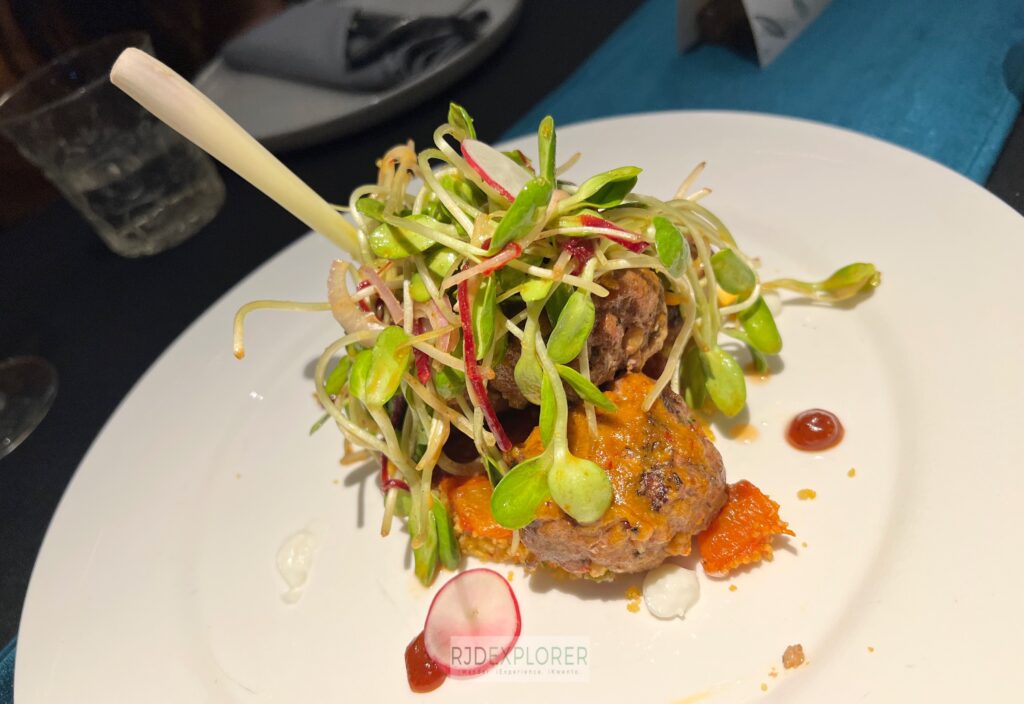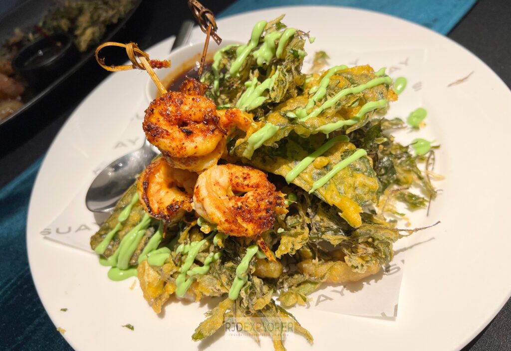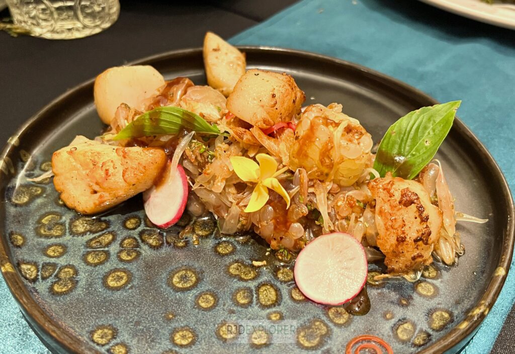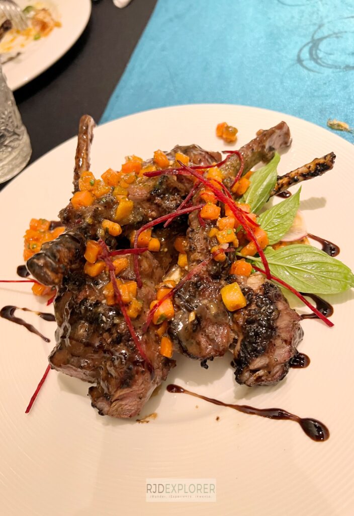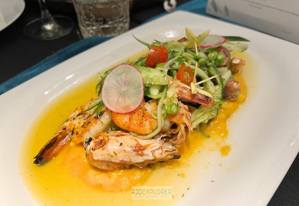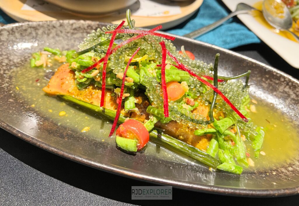 The meal began with starters that shaped the tone of the experience. The pomelo salad with grilled giant scallops tasted bright and refreshing. The sweetness of the scallops created a pleasant contrast that I enjoyed with every bite. The Thai leaf tempura arrived with grilled Cajun prawns in avocado sauce, and a tamarind dip. The dish tasted crisp and flavorful, and I paused for a moment to appreciate each detail. The lamb satay with peanut sauce and couscous salad brought richer flavors. It felt both familiar and new, and it showed how Suay Cherngtalay loved to balance textures.