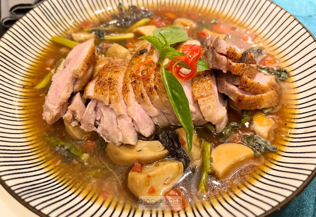 The mains arrived with vibrant plates and comforting notes. The grilled lemongrass lamb chops tasted tender and aromatic, and the papaya salsa added a fresh finish. The grilled tiger prawns came with Thai cucumber salad and salted egg sauce. The pairing offered heat and sweetness that felt balanced and inviting. The sea bass wrapped in banana leaf arrived with string bean salad and sea grapes. The dish carried a gentle tropical feel that reminded me of Phuket’s island charm. The crispy skin sous vide duck breast stood out as one of the highlights. The hot basil sauce lifted the flavors, and the perfectly crisp skin added a satisfying texture.