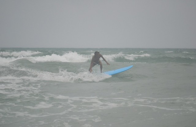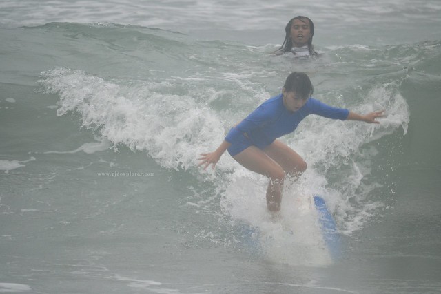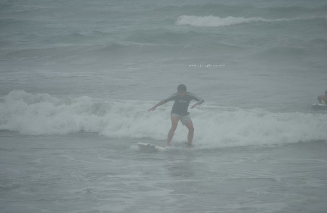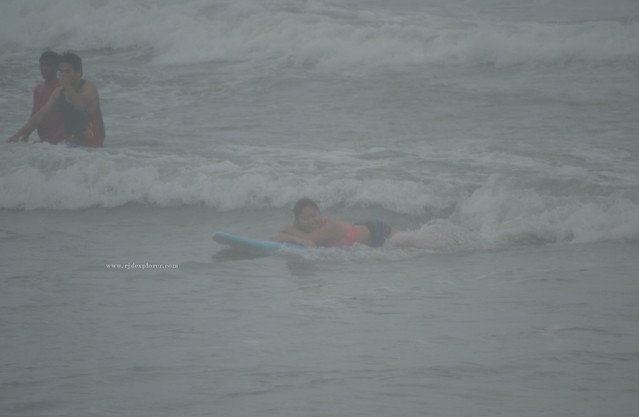 We continued to wait for waves as it grew larger and the rain pouring a bit harder. Two or more downs, my leg cramped. I created a T sign using my hands and we headed back to the shore. That time, his friend just finished using a long board, he exchanged it with the one I was using and after a few seconds, when he confirmed comforts on my leg, we found ourselves back to the water. He made an assurance that I will get to stand because the new board was longer, wider, and easier to balance.
