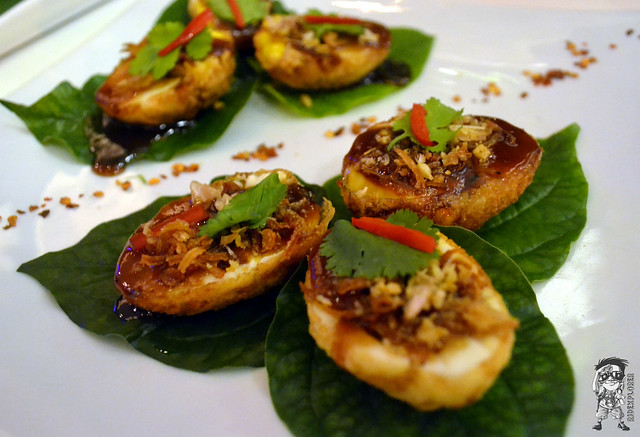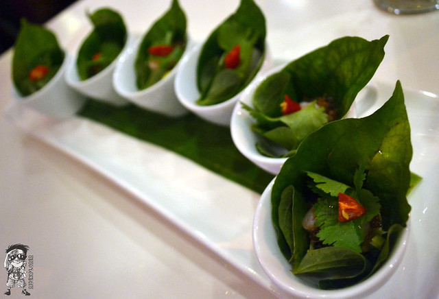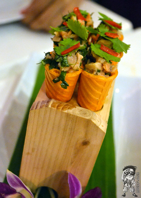 To begin the sumptuous meal were the four starters served: Mieng Kham, Salmon Cone, Son-in-Law Eggs, and Thai Ravioli. Mieng Kham, a traditional appetizer in Thailand, is actually a filling of some spices and a shrimp with a sauce wrapped in a fresh and crispy leaf. Salmon Cone is salmon cubes infused with lemongrass, lime and herbs and filled in ice cream cones.