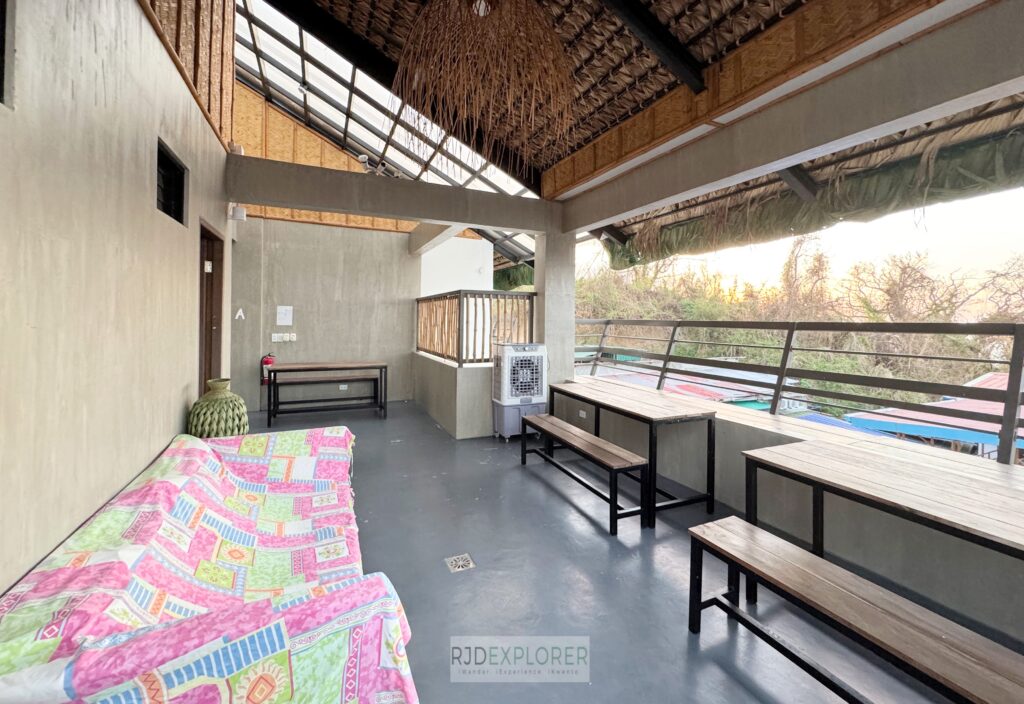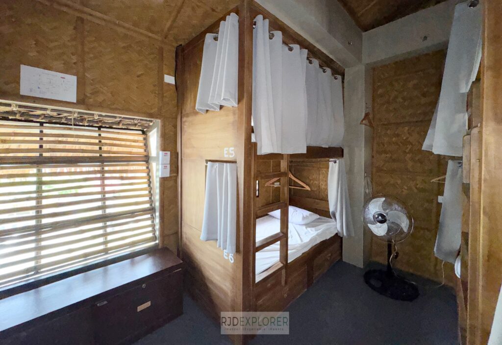I stayed in a fan room shared with seven other travelers on the second floor, just above the souvenir shop. Nipa hut materials make up the walls, giving the room a beachy, tropical feel. Even though it’s a fan room, the evenings in November were surprisingly cold, so a light sweater or hoodie is recommended.