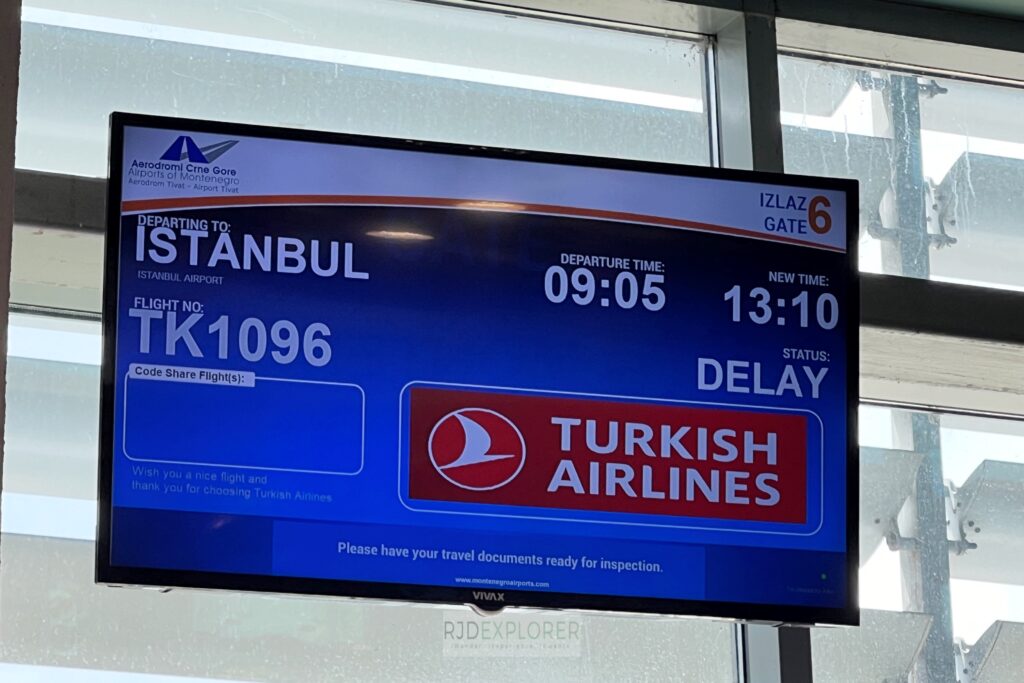 Due to bad weather, the aircraft scheduled for our return flight to Istanbul landed in Belgrade instead of Tivat Airport. Turkish Airlines staff gave us only a bottle of water during the four-hour delay at Tivat Airport. The departure hall at Tivat Airport has limited food options, so most passengers relied on vending machines for light snacks.