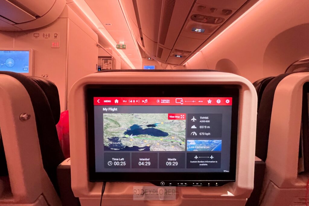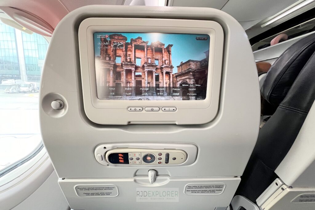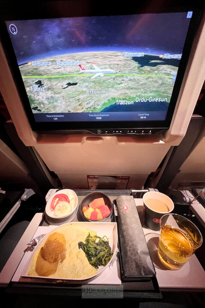 Turkish Airlines’ Economy Class offers a commendable level of comfort. Upon arriving at your seat, you are greeted with a travel pouch containing socks, toothpaste, a toothbrush, an eye cover, in addition is a headset, a blanket, and pillows. The seats had adjustable headrests, and the entertainment system featured a wide array of movies, TV shows, music, and games. The personal screens were responsive and of high quality. Each seat also had a USB port and power outlet, which was convenient for charging devices during the flight.