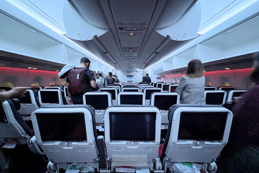 Boarding was efficient, with passengers called in groups exactly 45 minutes before the estimated departure. The Economy Class cabin appeared modern and clean, with comfortable seats and ample legroom. The friendly crew welcomed passengers warmly, setting a positive tone for the flight. The plane was an Airbus 350-900 with a 3-3-3 seating configuration.