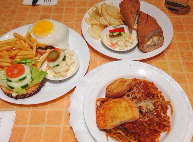 Kilimanjaro Kafe’s Powerhouse Cheeseburger, Deli Chicken Salad, and Spaghetti Bolognese.