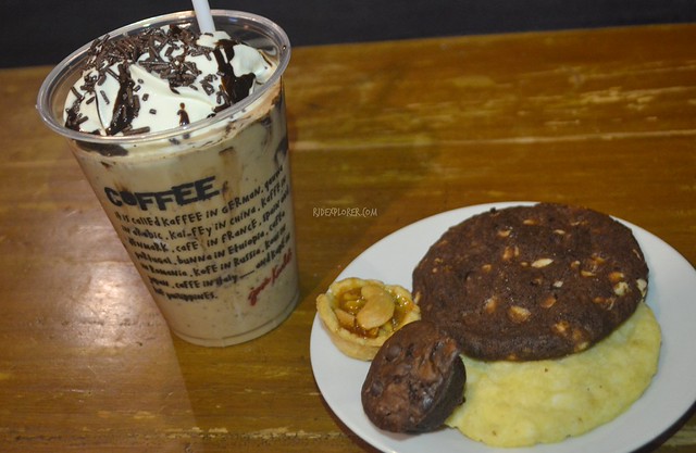 I ordered a Mescoccino Karlo, their signature blended beverage with chocolate chips. They also have hot and iced espresso beverages, the basic brewed coffee, chocolate drinks, tea, and fruit drinks. Coffee always comes with cakes and pastry and their offerings include cakes, crumble pie, muffins, brownies, chunk cookies, and tarts. For my Mescoccino Karlo, I got white chocolate chunk cookie (Php18), chocolate walnut chunk cookie (Php20), brownie tart (Php10), and cashew tart (Php12). (Juan Luna St., Tacloban City)