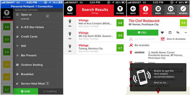 With the explore option, you can access the list of nearby restaurants having their locations, cuisines being served and the average rating given by different foodies who already tried the food place. You can also filter the list in terms of location, cuisines, cost, and other information such as operation hours, WiFi accessibility, if they accept credit cards and serving Halal Meat.